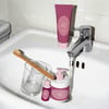 A bathroom skincare mockup presented in a sink with direct flash lighting and strong shadows. The bold, unconventional composition highlights a tube, dispenser jar, and small bottle.
