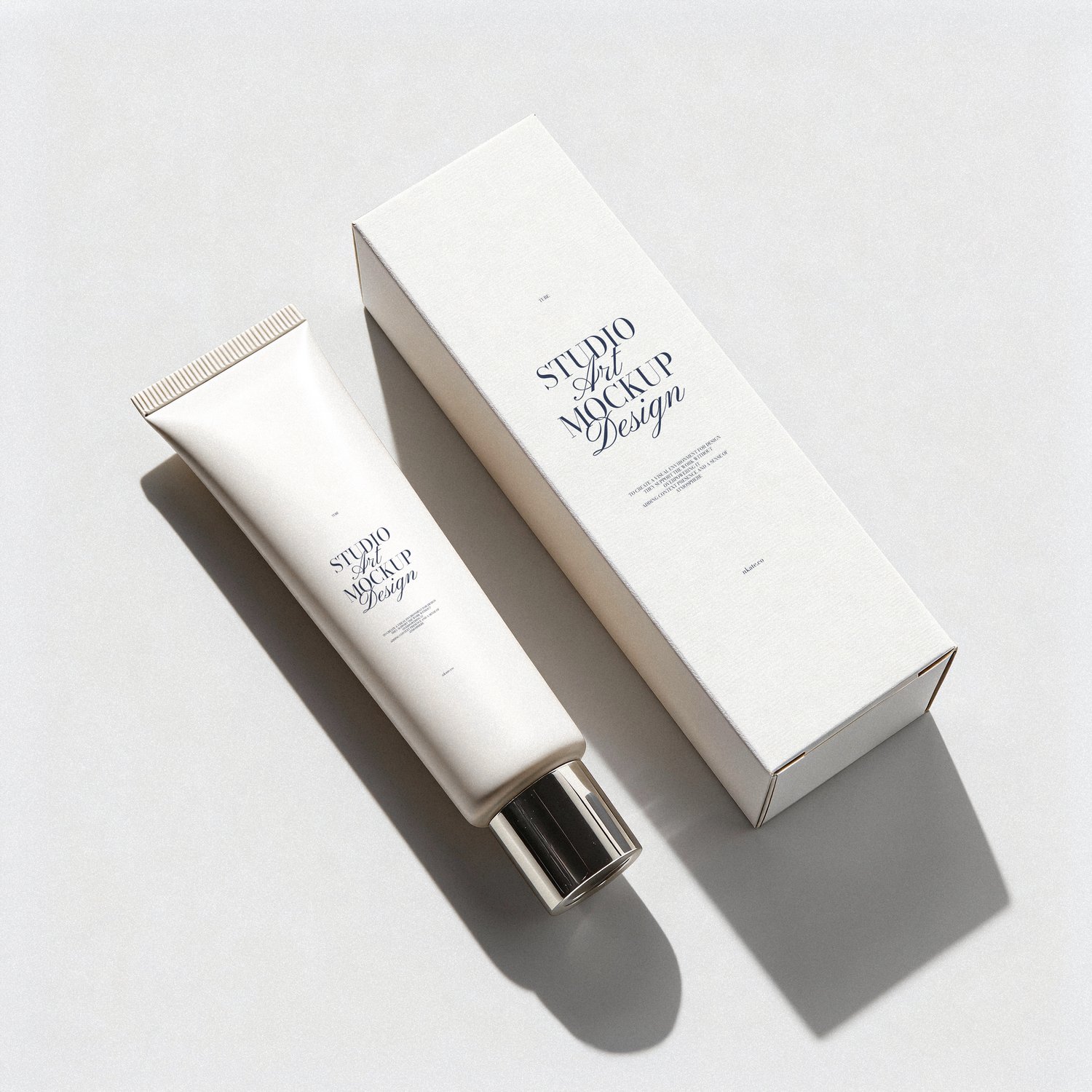 A cosmetic tube with a matching box presented on a neutral background with directional light and defined shadows.