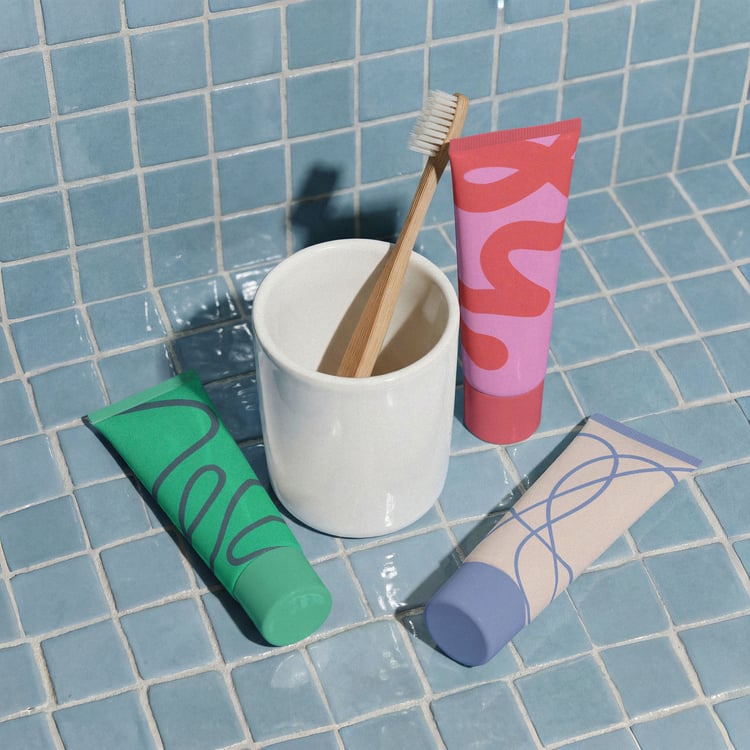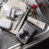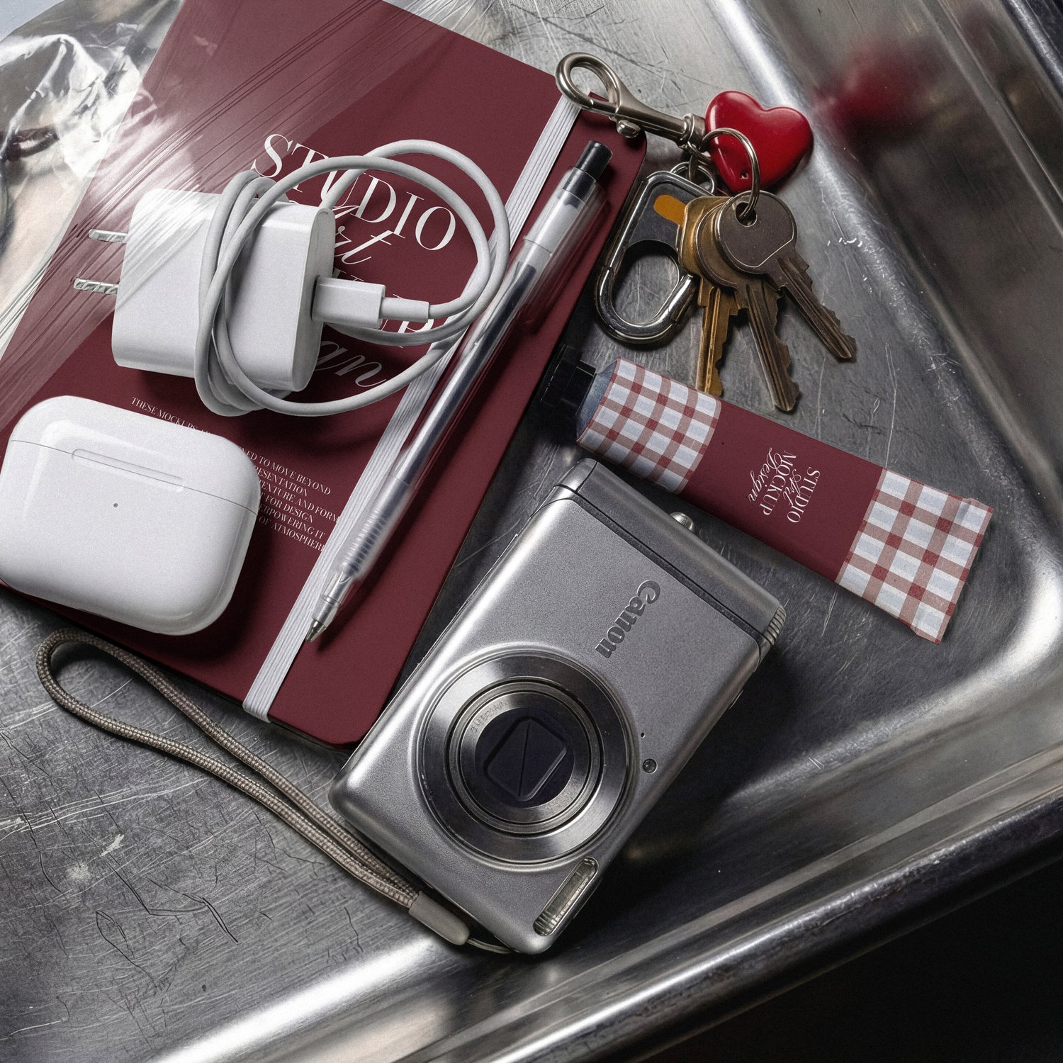 A cosmetic tube placed alongside a notebook and everyday personal items on a metallic surface.