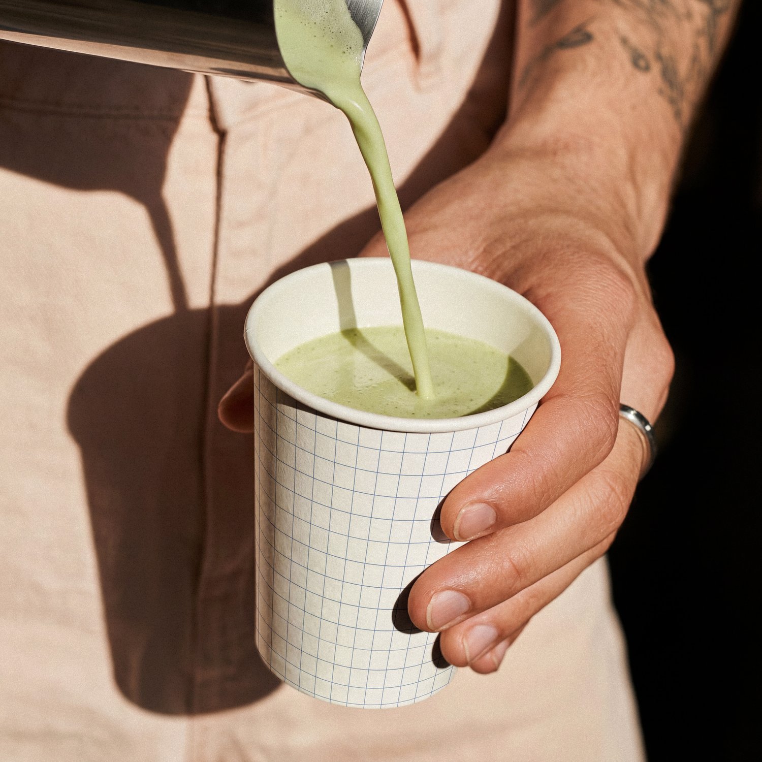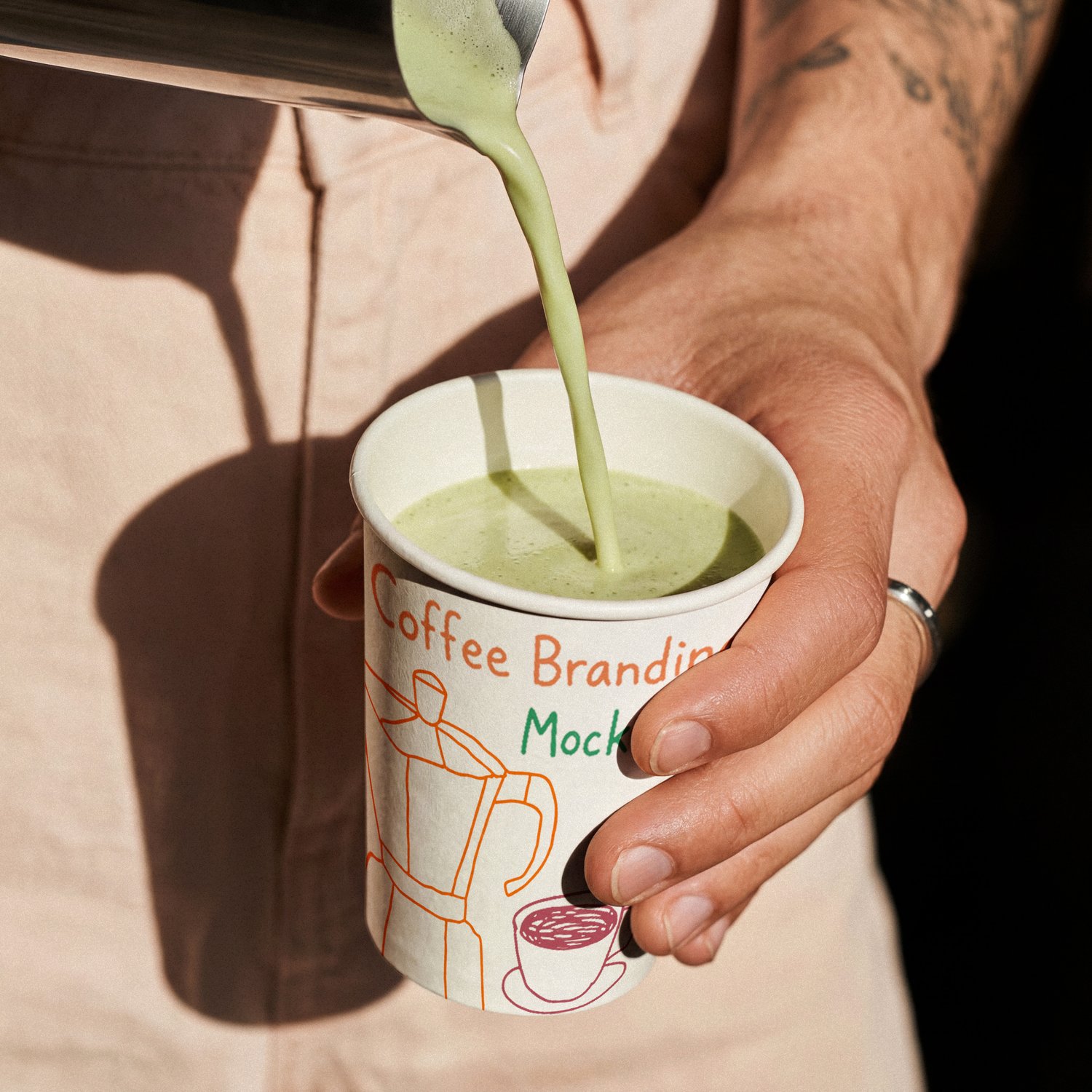 A clean beverage scene featuring a pouring drink in a paper cup, ideal for showcasing branding, packaging design, or café identity in a realistic presentation.